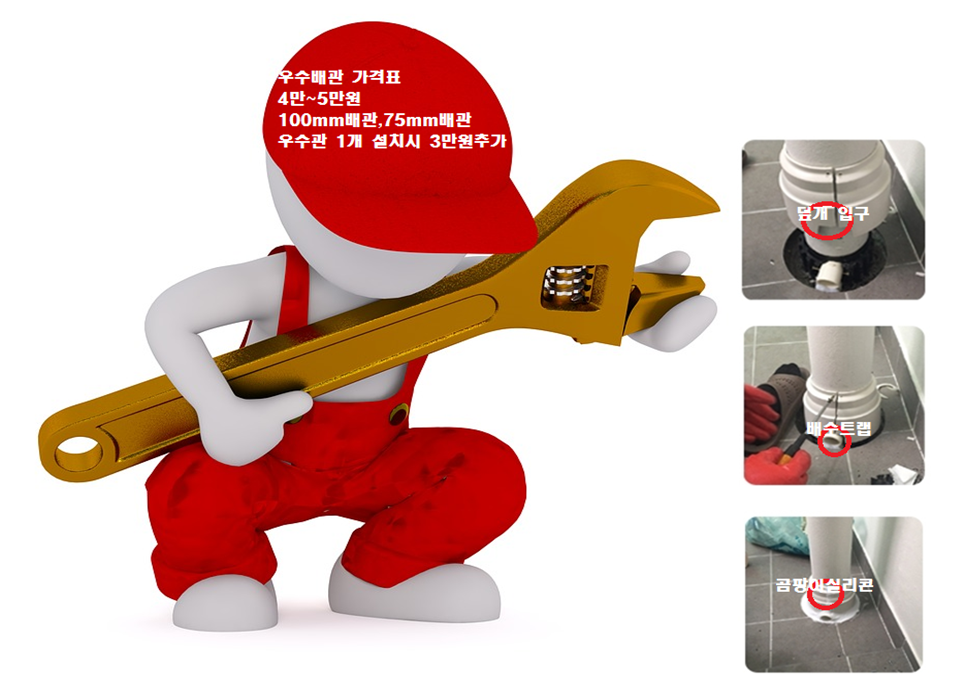 냄새차단가격표 하수구 가격표 (욕조,씽크대,바닥,세면대) 2개이상 설치시 출장비 포함 30,000원 1개 설치시 출장비 포함 50,000원 발생됨 홈통(S트랩+홈트랩+스텐레스홈통) 풀셋트 100,000원 우수관 가격표 (아파트 베란다) 우수관설치(트랩,커버)비용 100,000원 소변기/양변기 가격표(관공서,화장실,영업장) 소변기/양변기 구조에 따라 협의